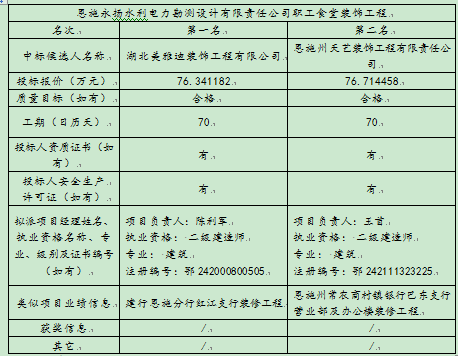 恩施永扬水利电力勘测设计有限责任公司职工食堂装饰工程评标结果公示