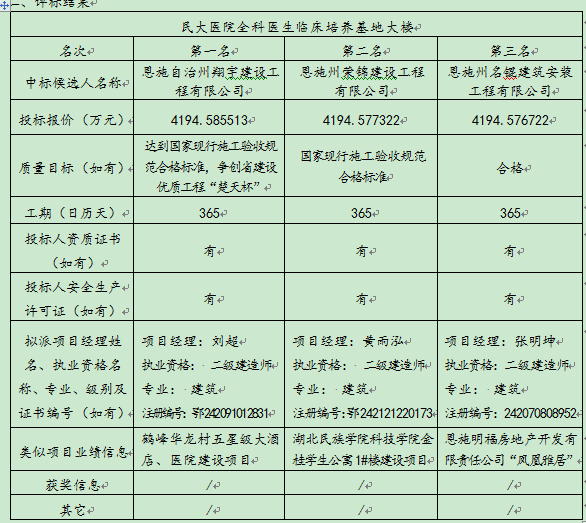 民大医院全科医生临床培养基地大楼于 2015 年11月13日至2015 年11月18日在恩施州公共资源交易中心 宣布招标通告 ,2016年1月 5日在恩施州公共资源交易中心开标大厅(恩施市施州大道58号邮政局四楼)开标 ,并于 2016年 1月 5日完成评标事情。凭据评标委员会提交的评标报告 ,湖北民族学院隶属民大医院已经确认评标结果 ,现进行评标结果公示。
