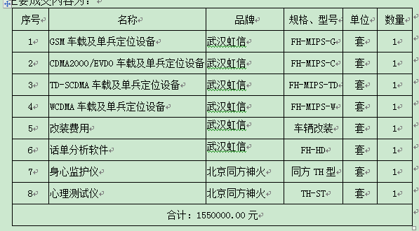 采购内容:手机定位设备一套,包括GSM、CDMA2000/EVDO、TD-SCDMA、WCDMA四种制式的车载及单兵定位设备;话单剖析软件一套;身心监护仪一套;心理测试仪一套;