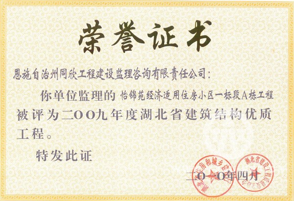 2009年度湖北省结构优质工程怡锦苑经济适用住房小区一标段A栋工程